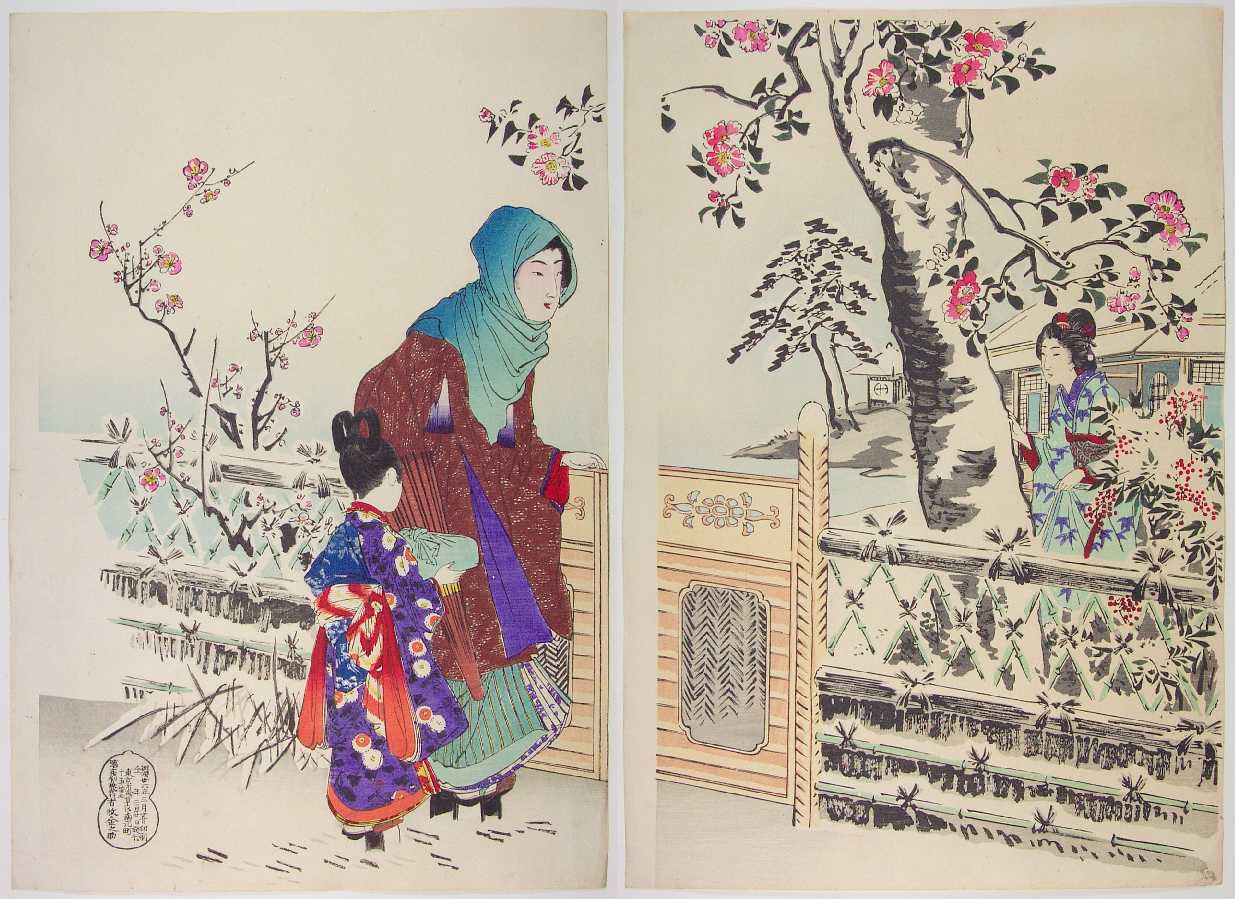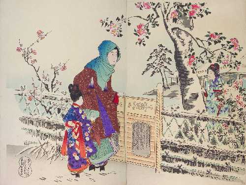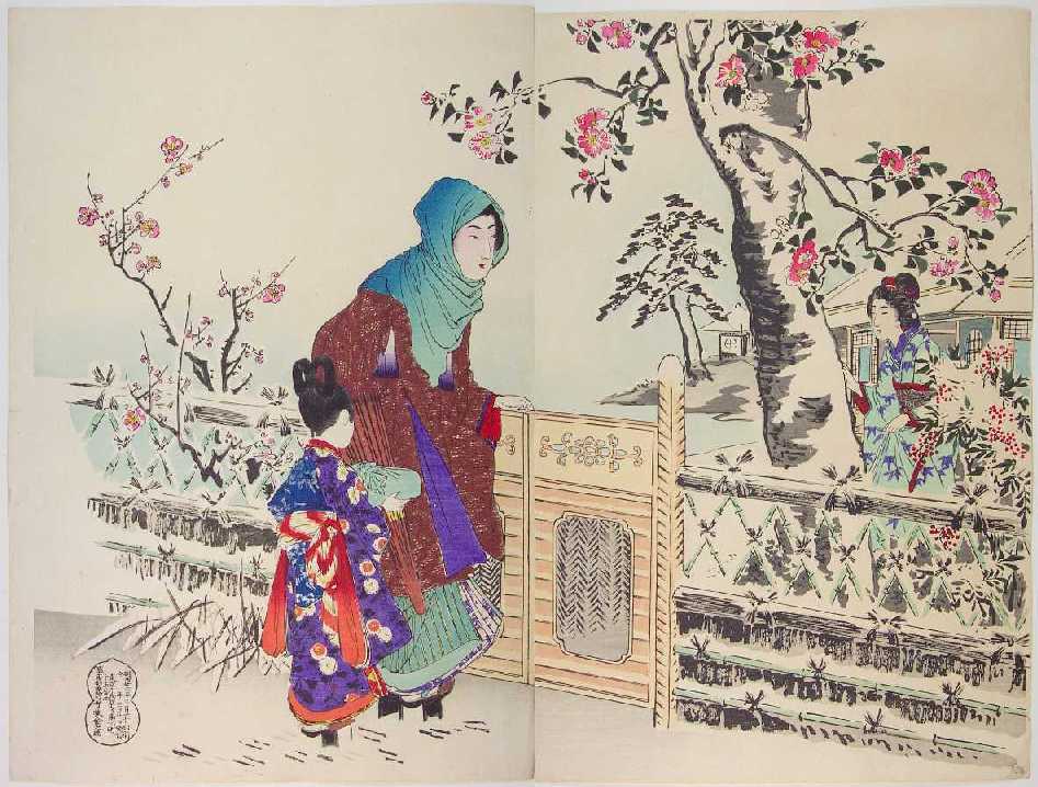 accompanied by a young girl bearing a wrapped gift. Spring snow contrasting