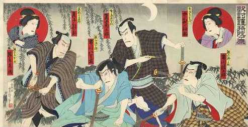 An expressive kabuki scene of four commoners engaged in an evening