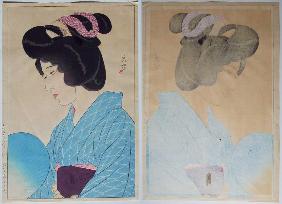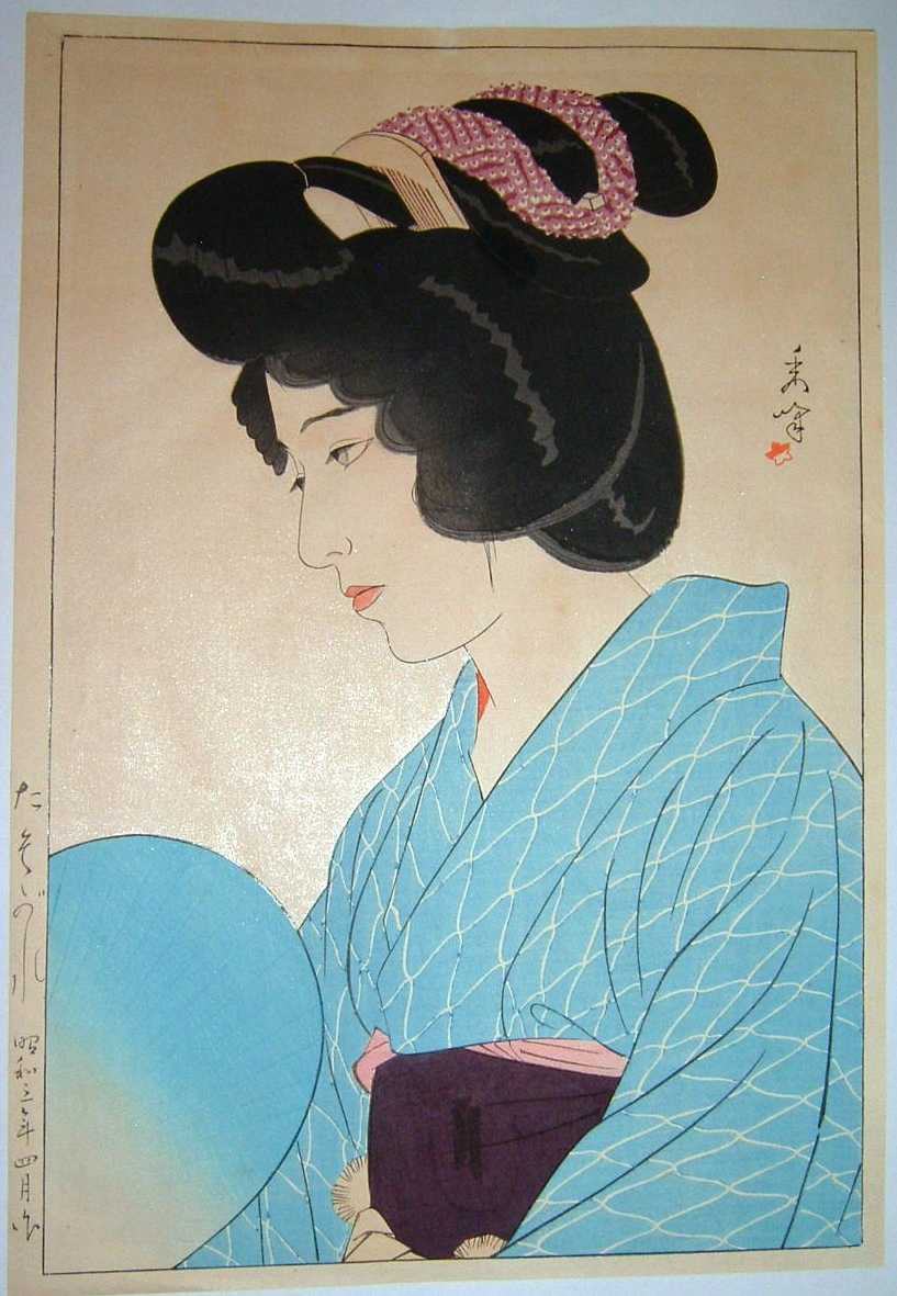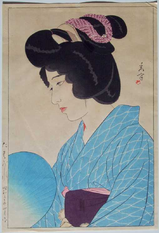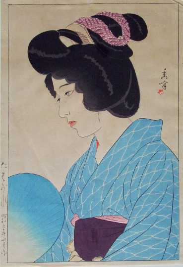 Clothed in a light blue summer kimono, this pensive beauty cools herself with a hand-held fan.