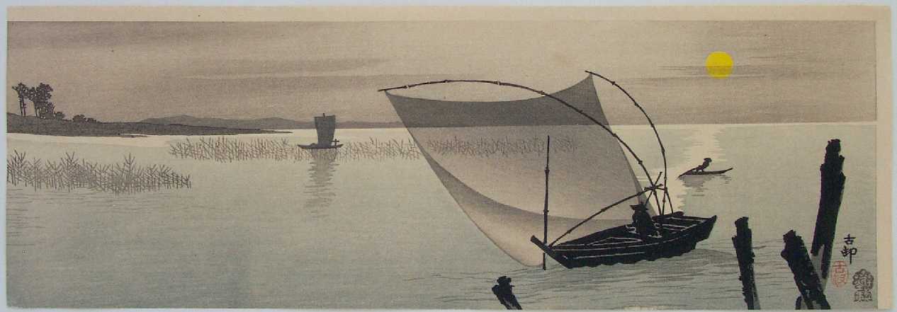 Fishing at dusk under a pale moon. PRE-1910 (Note: Kokkeido Publisher ceased business in