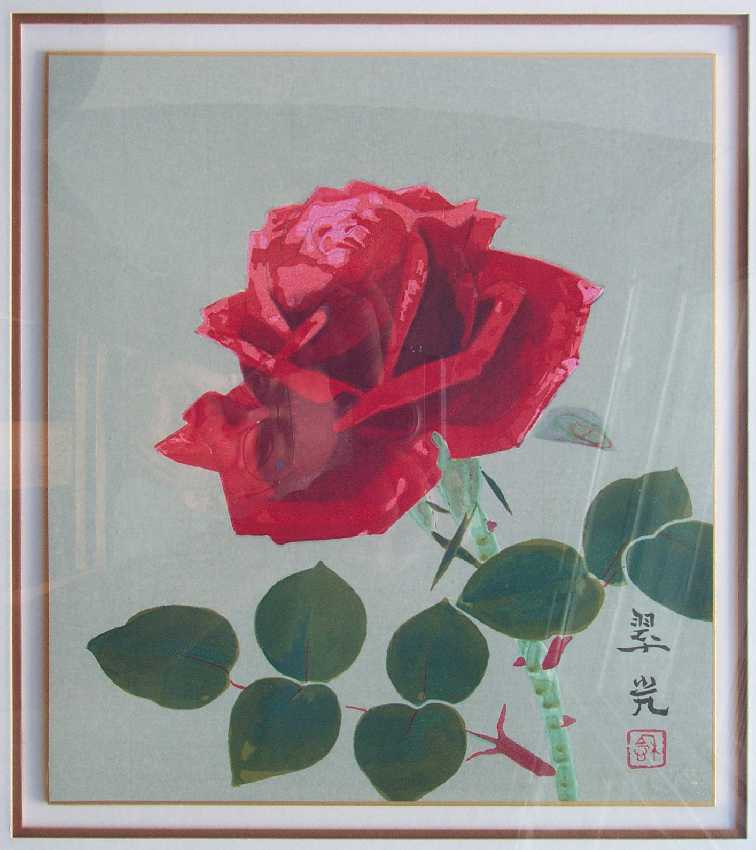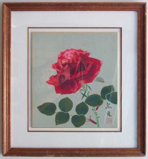 Colorful red rose image mounted as gild-edged "shikishi-ban" format and framed. |