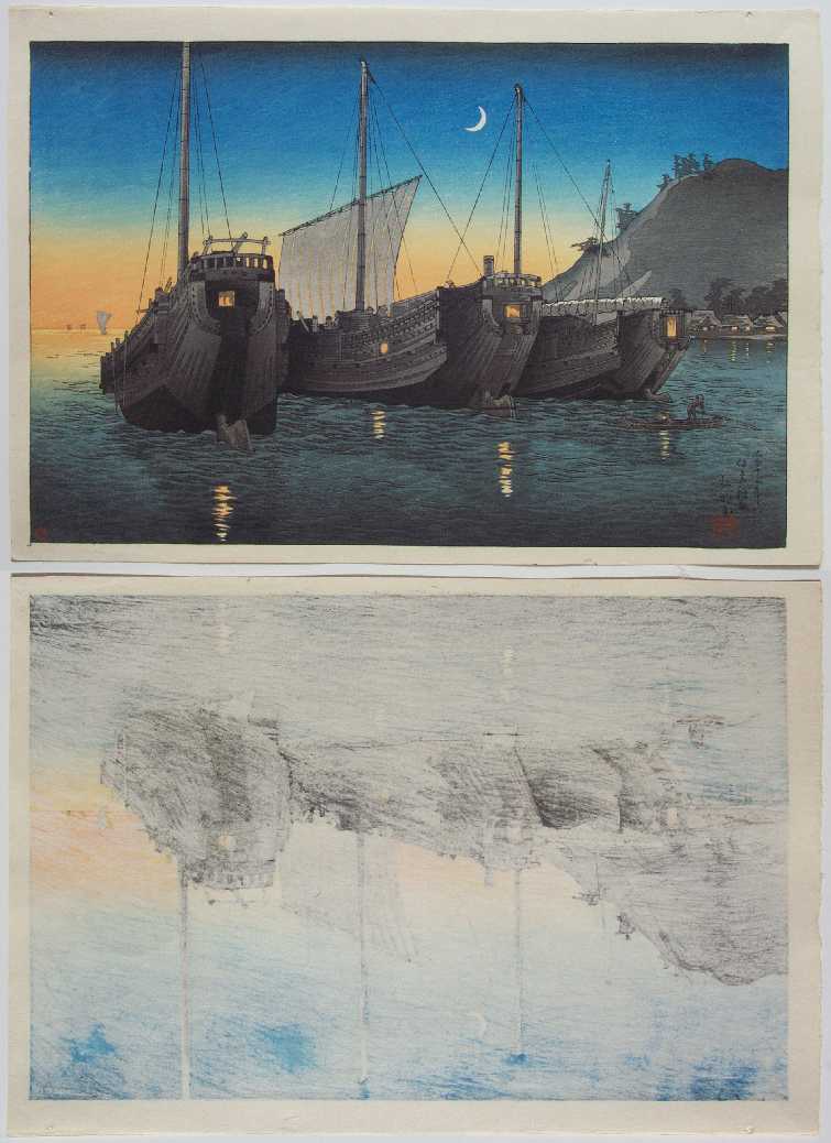 Very Fine. Superbly executed "bokashi" shading; light "gauffrage" to ribbed sails,