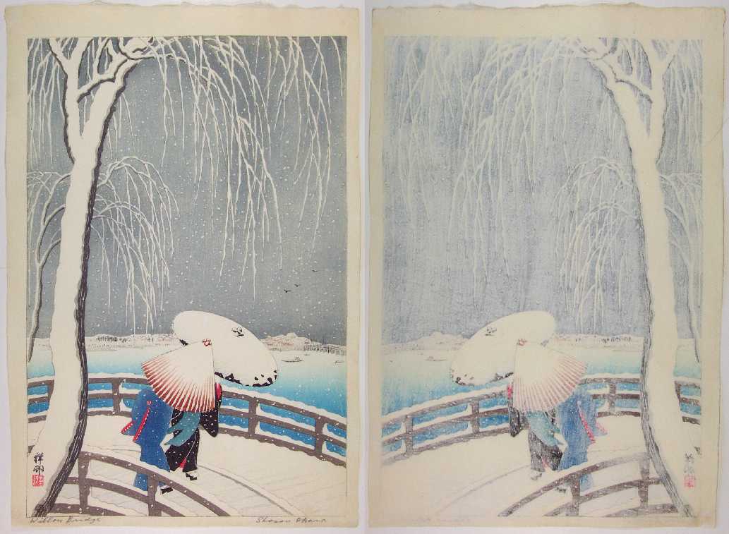 accumulation, umbrealla, and bridge boards; lightly over-splashed "gofun" snow; baren "sujizuri"