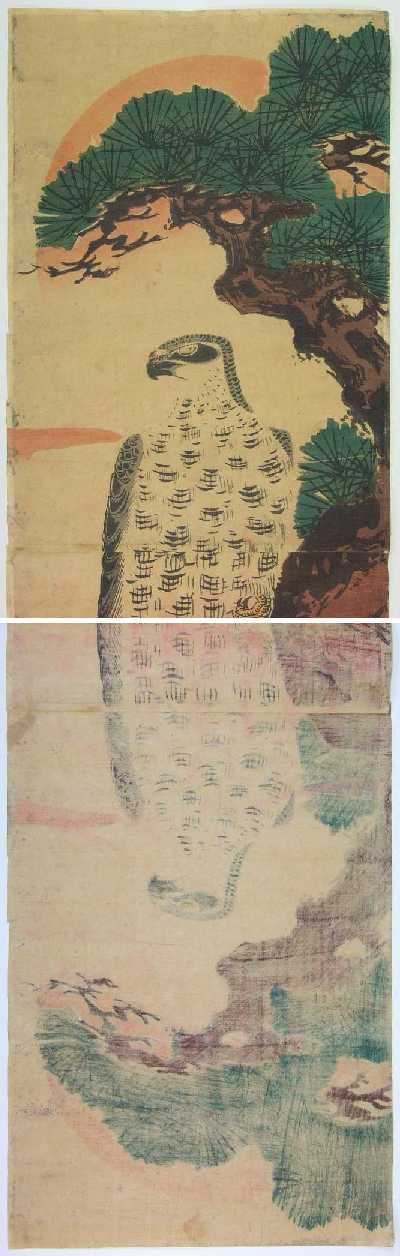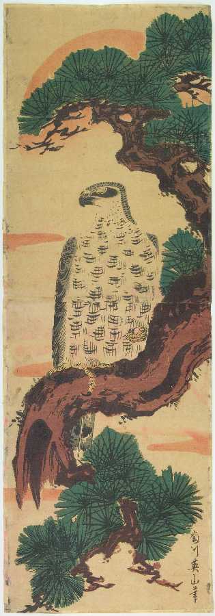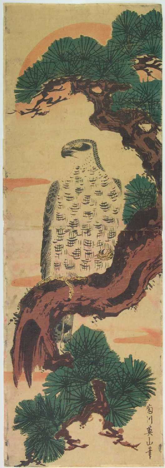 A handsome "kacho-ga" Eizab design of a hawk resting atop a pine