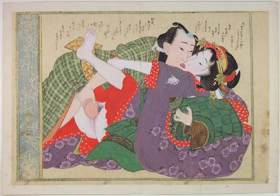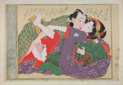Highly detailed/colorful "shunga" image of an amourous couple.