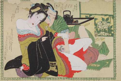 Highly detailed/colorful "shunga" image of an amourous couple.