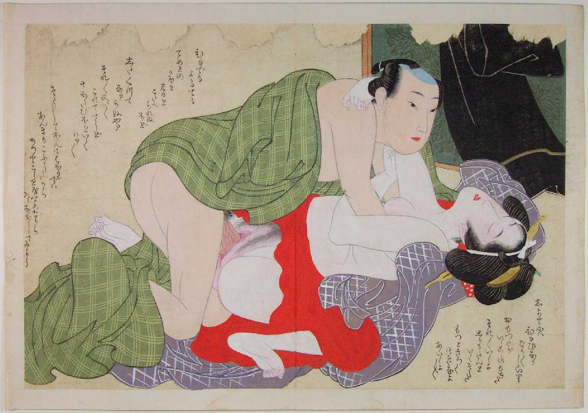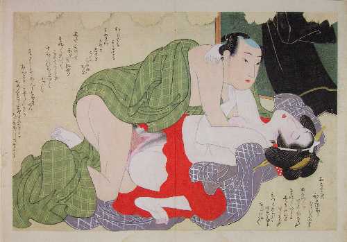 Highly detailed/colorful "shunga" image of an amourous couple.