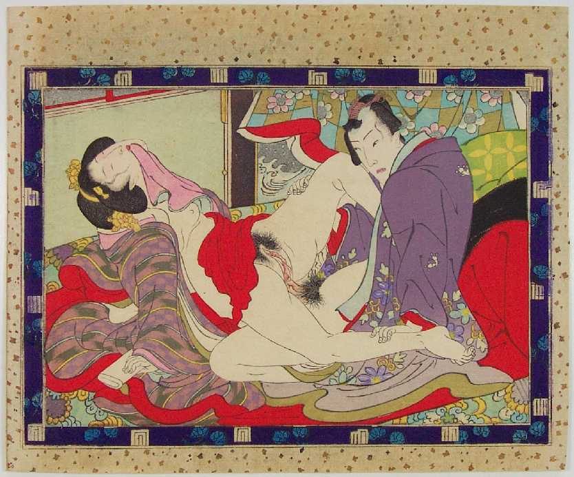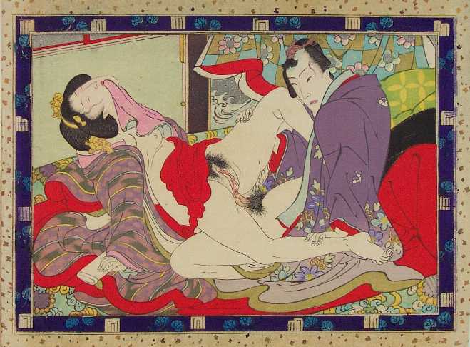 Very highly detailed and colorful "shunga" image of an amourous couple.