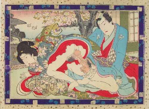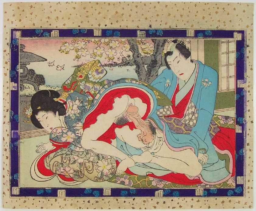 Very highly detailed and colorful "shunga" image of an amourous couple.