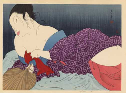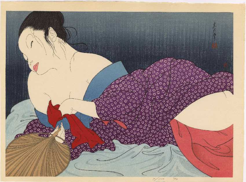 A strikingly sentuous modern-day "bijin-ga" image--eyes closed, bared shoulders.