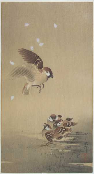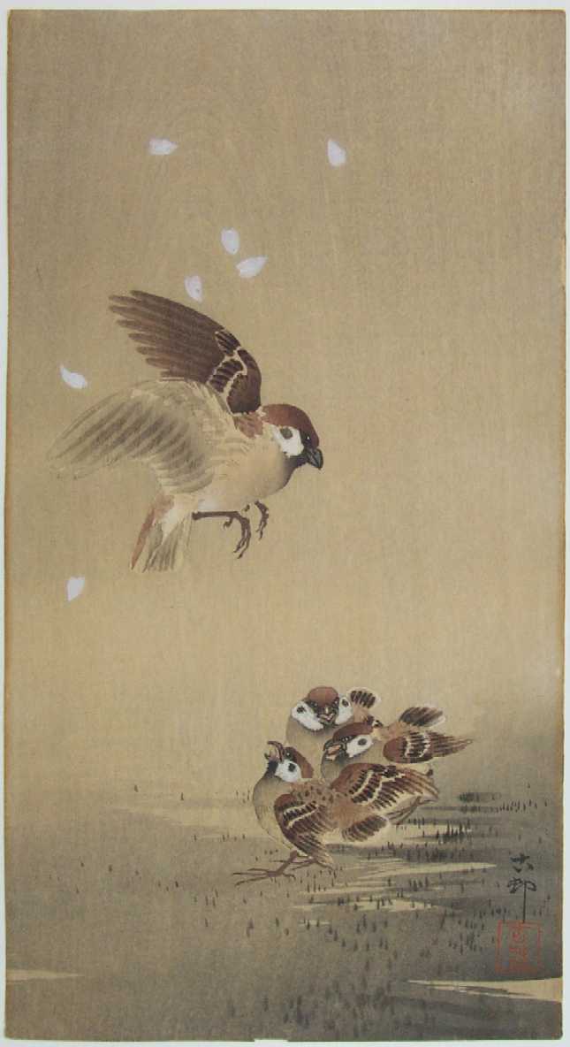 Under falling cherry blossoms, a tree sparrow in flight above three chicks.