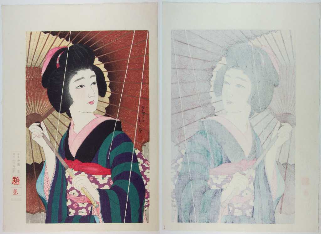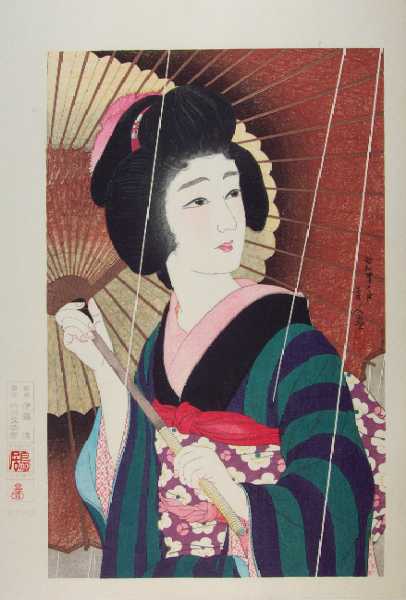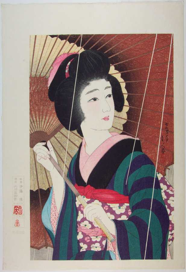 Very Fine. Skillfully executed "bokashi" (gradation of colors) shading to face and yellow of umbrella;