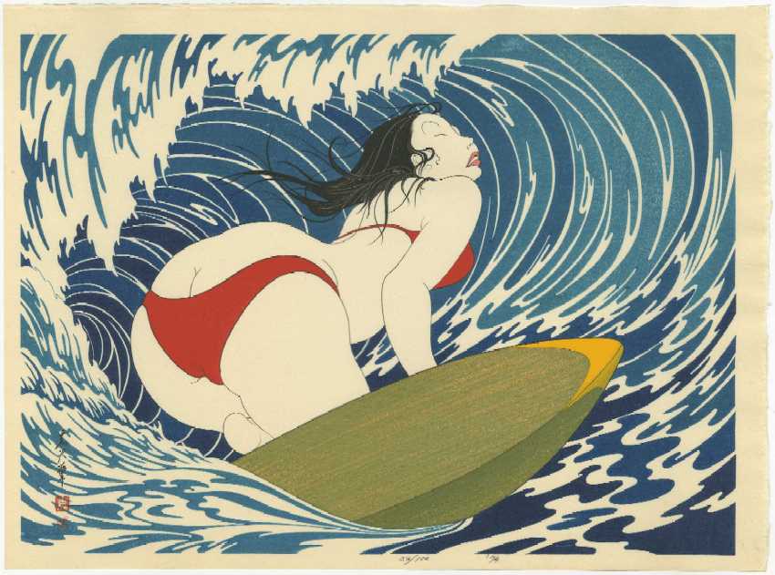 A strikingly voluptuous modern-day "bijin-ga" image--surfing eyes-closed under