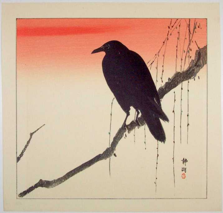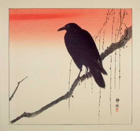 A bold and colorful image of a crow silhouetted against an orange evening sky. Believed pre-1923 earthquake