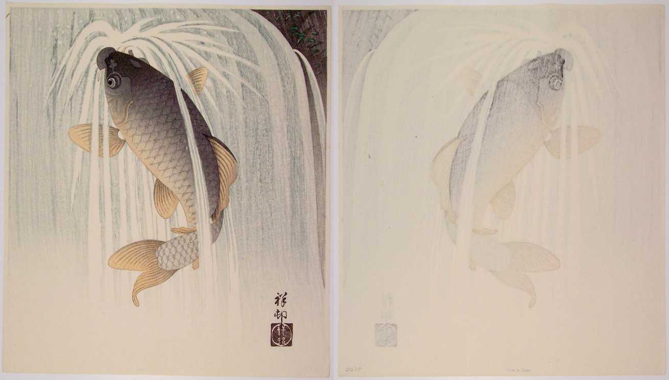 (embossing) to carp and falling water; crisp lines,