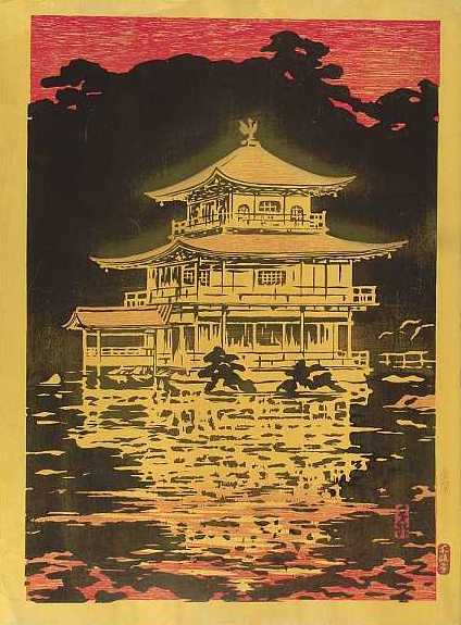 A strikingly large semi-abstract image of Kyoto's Golden Pavilion with