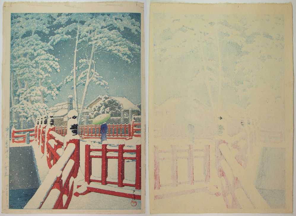 Very Fine. Skillfully executed "bokashi" shading to sky, trees, umbrella and kimono, bridge