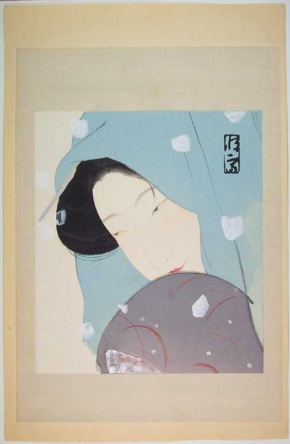 Very Fine. Nicely executed "bokashi" (gradation of colors) shading; snowflakes depicted in "gofun" (white overprinting);