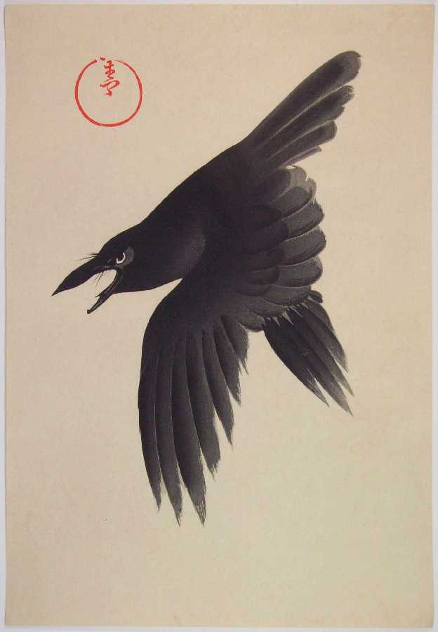 A dramatic 1920/30's print of a crow diving downward with beak open cawing