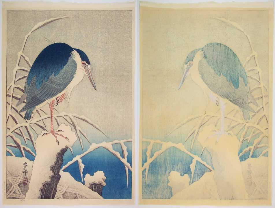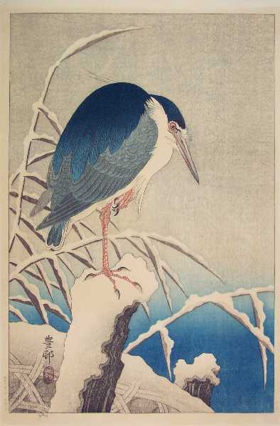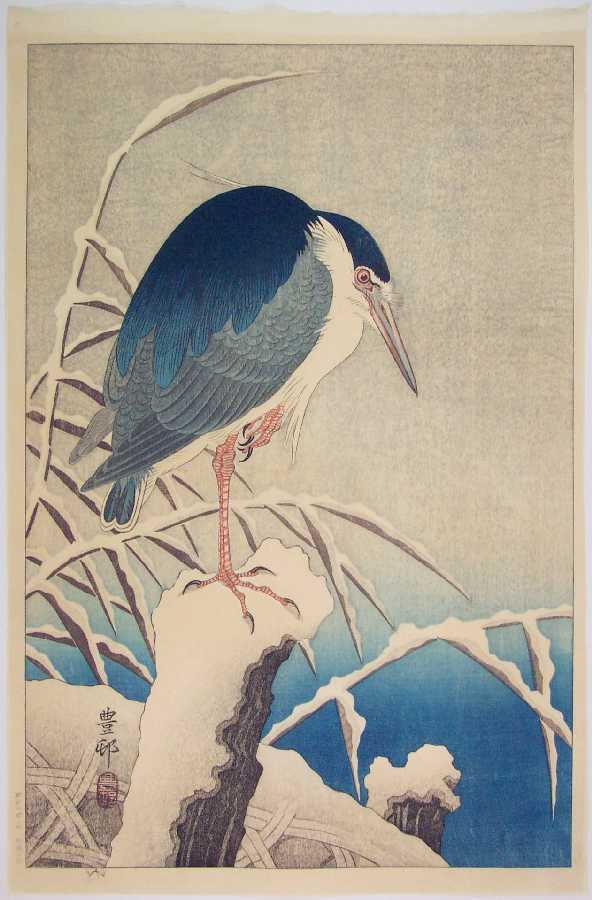 Superbly executed soft "bokashi" shading to heron, snow-covered areas, and background; light