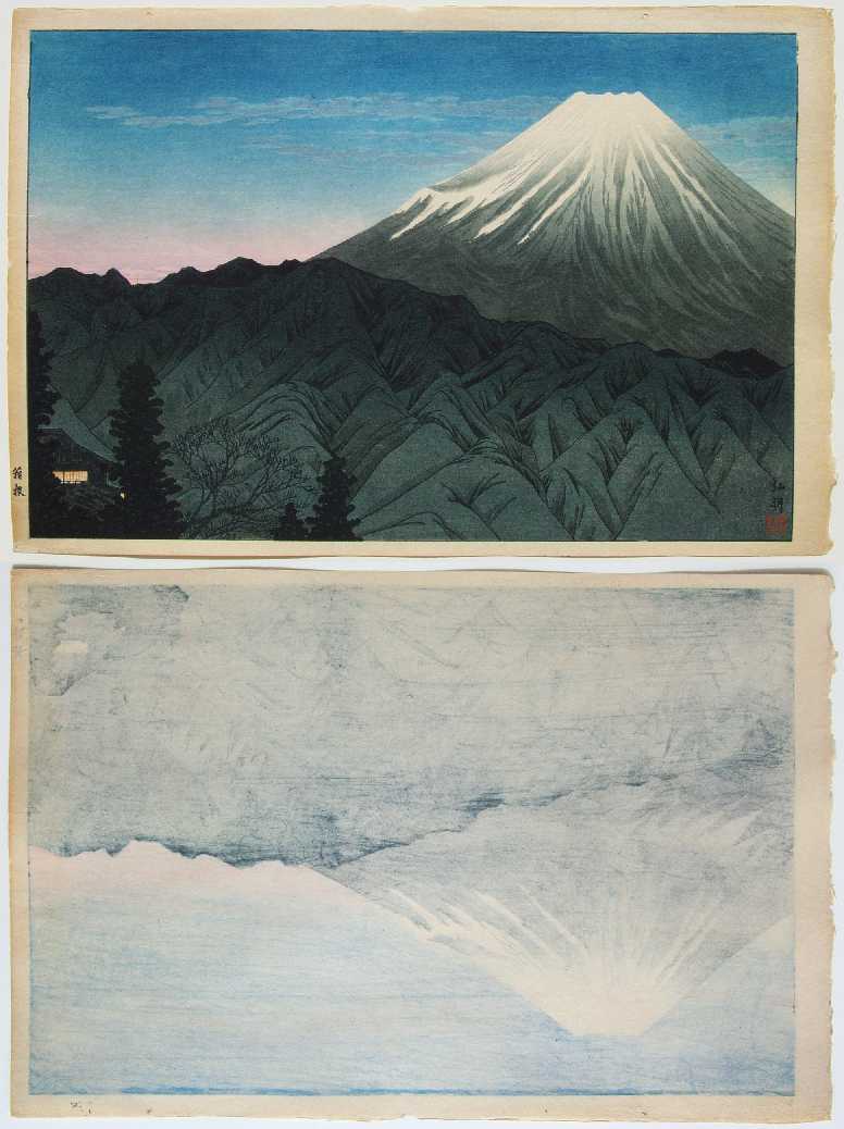 Superbly executed "bokashi" shading throughout; light "gauffrage" (embossing) to Fuji's