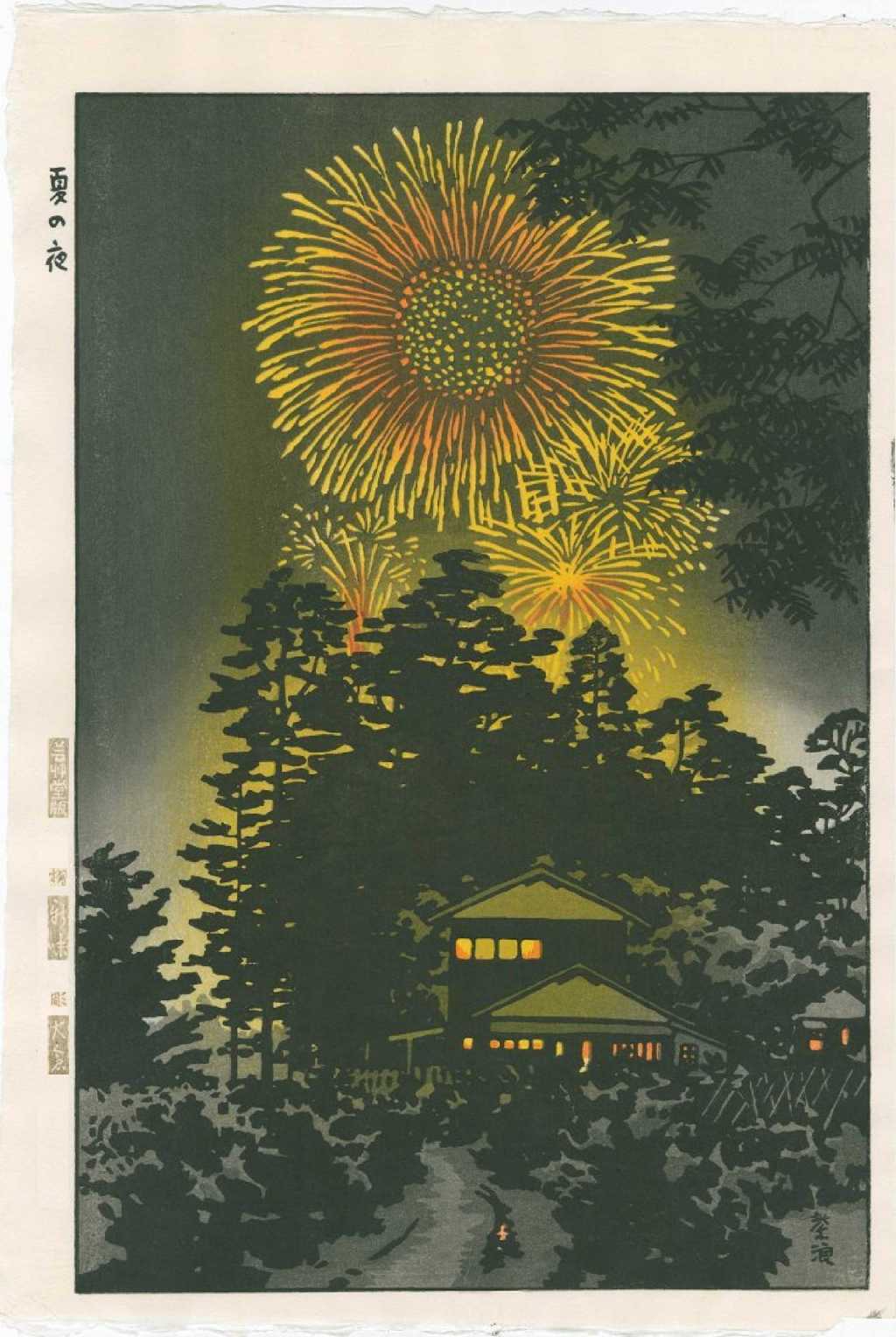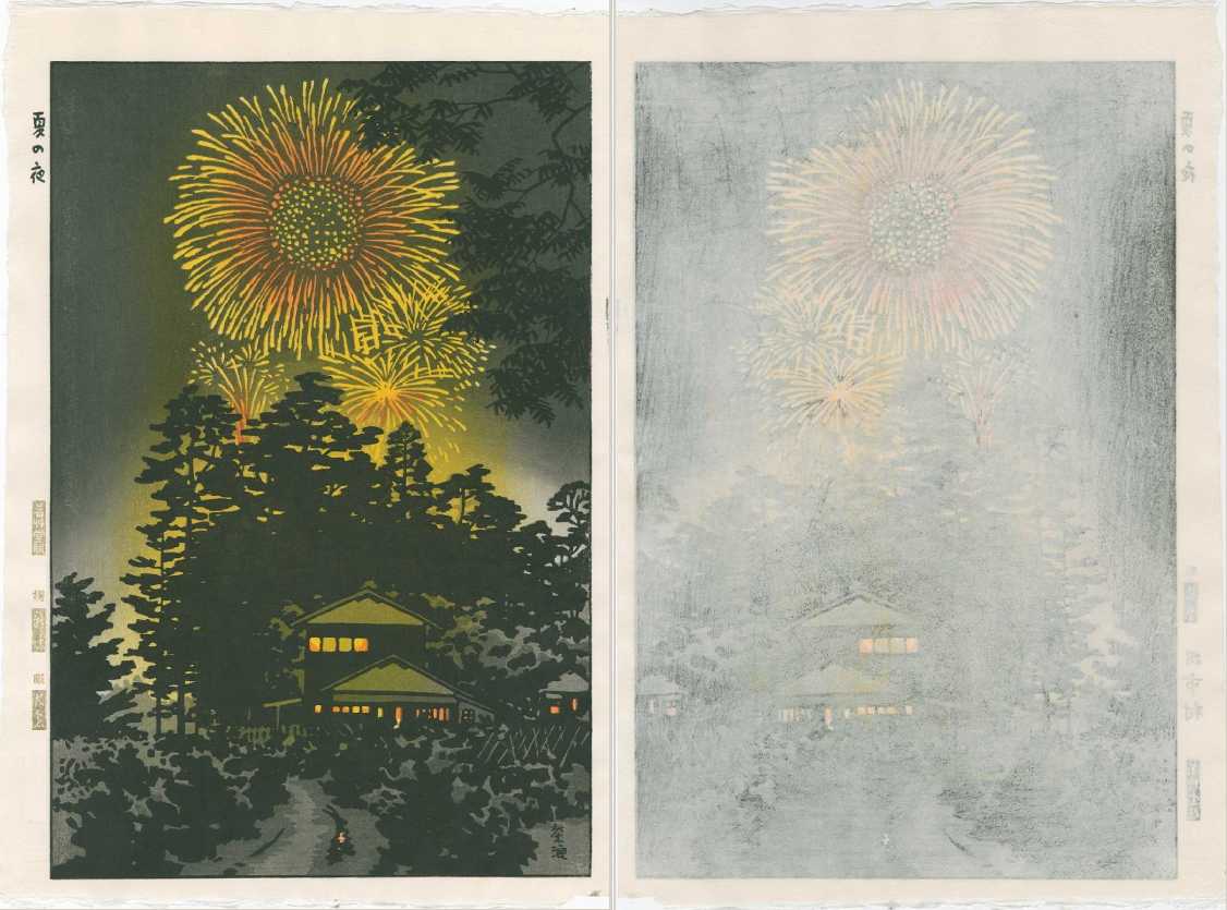 Skillfully executed "bokashi" shading to sky and firework's colors; nicely visible