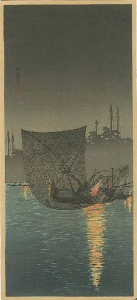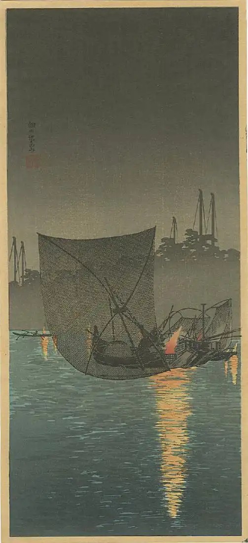 A striking evening image with fishing net silhouetted against the sky at Tsukuda Island. |