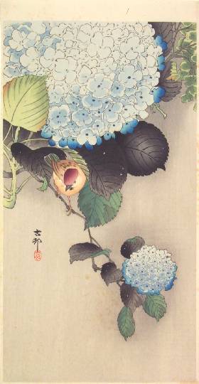 Very Fine. Wonderfully executed "bokashi" shading to hydrangea's leaves and flowers, bird, and sky area; visible woodgrain to grey background; extremely fine detailing. |