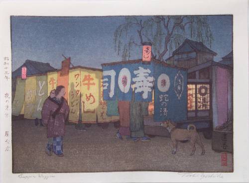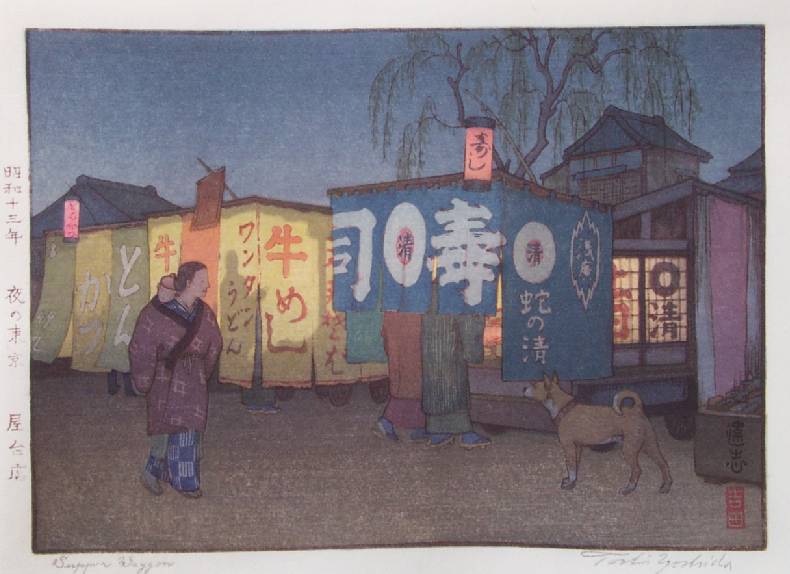 Lovely evening scene. (The print's actual translation is "Night in Tokyo--Supper Wagon.") |