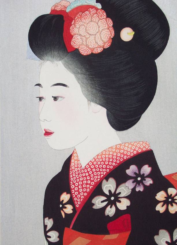 "Bijin-ga" artist and student of Gekko. Re-strike published as small/immediately sold out edition (100 copies) in the mid-1980's by Ishukankokai Publisher of Tokyo (with red "moneybag" seal). |