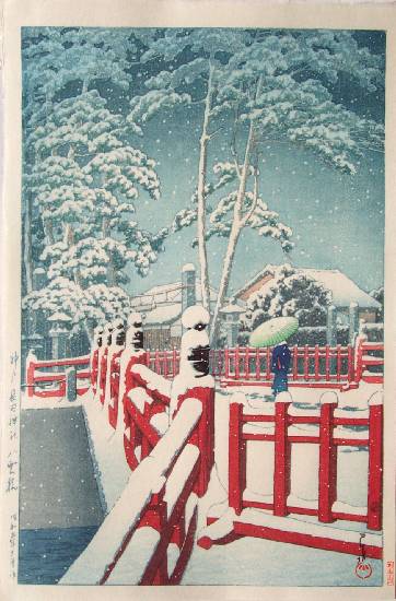 Very Fine. Skillfully executed "bokashi" shading; "gauffrage" to snow accumulation on bridge, trees and umbrella;