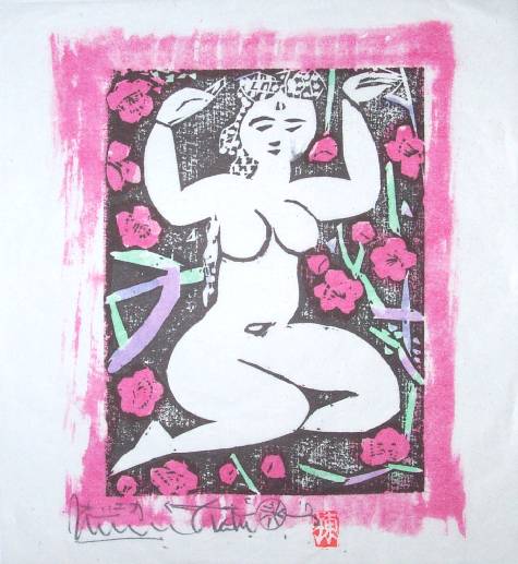 An attractive, bold "sosaku hanga" image. Commissioned by Yasukawa Electric Corp. as a "calendar print." |