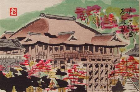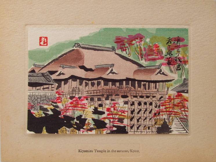Fine. Delightful "semi-sosaku hanga" style carving; "bokashi" shading to rooftop. |