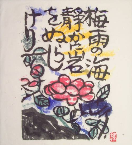 An attractive, bold "sosaku hanga" image. Munakata is well-known for his spontaneously carved black/white prints. |