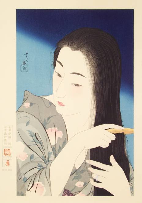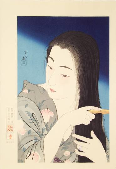 Very Fine. Over-printed hairlines; superb "bokashi" (gradation of colors) shading to face, kimono's flowers, and blue background; light "gauffrage" to kimono's flowers and eyebrows; silver metallic pigments on ring; highly detailed carving. |