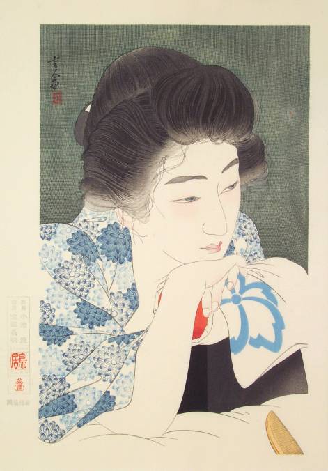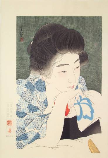 Very Fine. Over-printed hairlines; superb "bokashi" (gradation of colors) shading to face and head-rest; light "gauffrage" to green mosquito netting; highly detailed carving. |