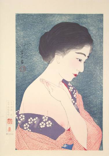 Very Fine. Nicely over-printed hairlines; superb "bokashi" (gradation of colors) shading to face, hand and body; light "gauffrage" to face, hand, and red robe; light "burnishing" to hair; bold "sujizuri" tracings to background; highly detailed carving. |