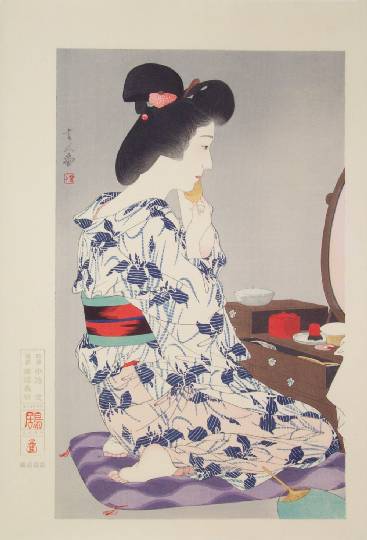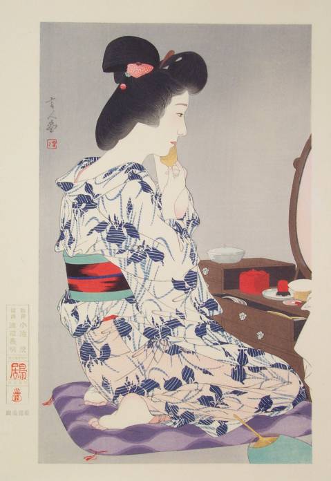 Very Fine. Superb "bokashi" (gradation of colors) shading to face, kimono, and background; extensive "gauffrage" to entire kimono; nicely visible woodgrain to background; highly detailed carving. |