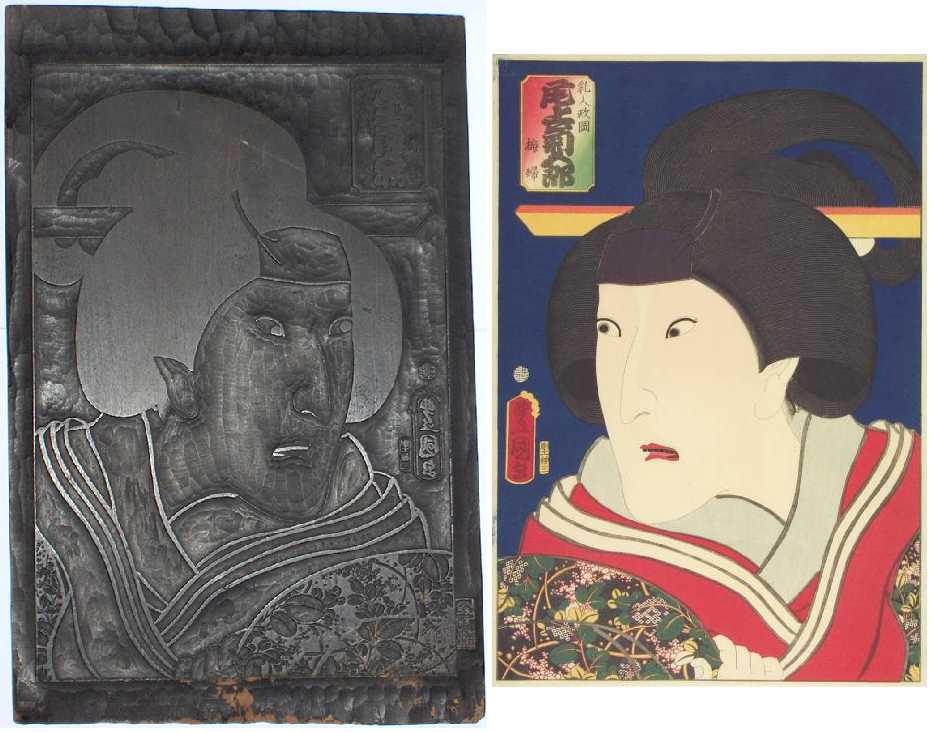 Very Fine. Nicely executed "bokashi" shading to face and cartouche;