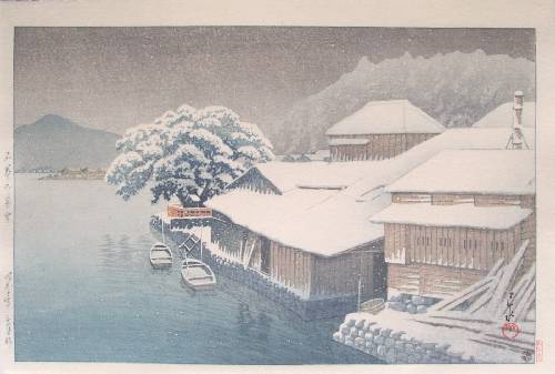 Peaceful wintertime snowscene. Reissued in 2003 by Watanabe using their original woodblocks from 1935; other such recently reissued