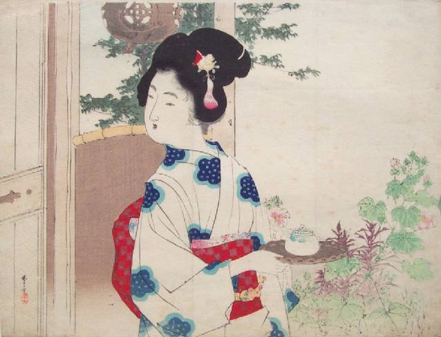 Dressed in a light summer kimono, this bijin carries a tray with teapot. |