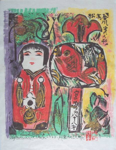 Fine. Bold black-ink/color "sosaku" printing on thin Japanese paper. |