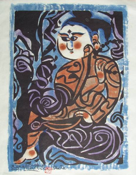 An attractive, bold "sosaku hanga" image. Munakata is well-known for his spontaneously carved black/white prints. |