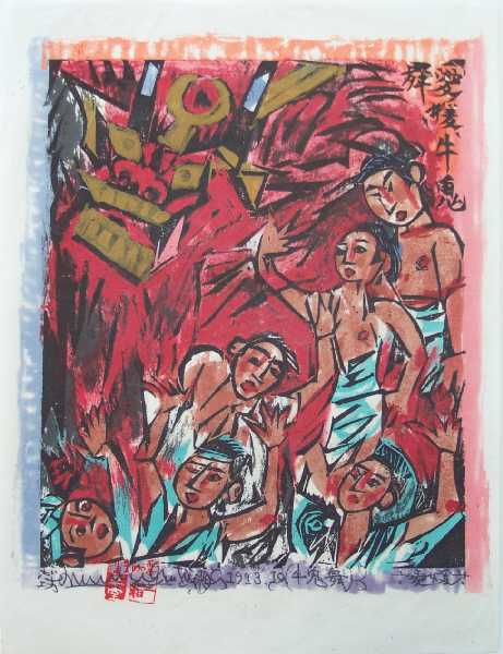 Fine. Bold black-ink/color "sosaku" printing on thin Japanese paper. |