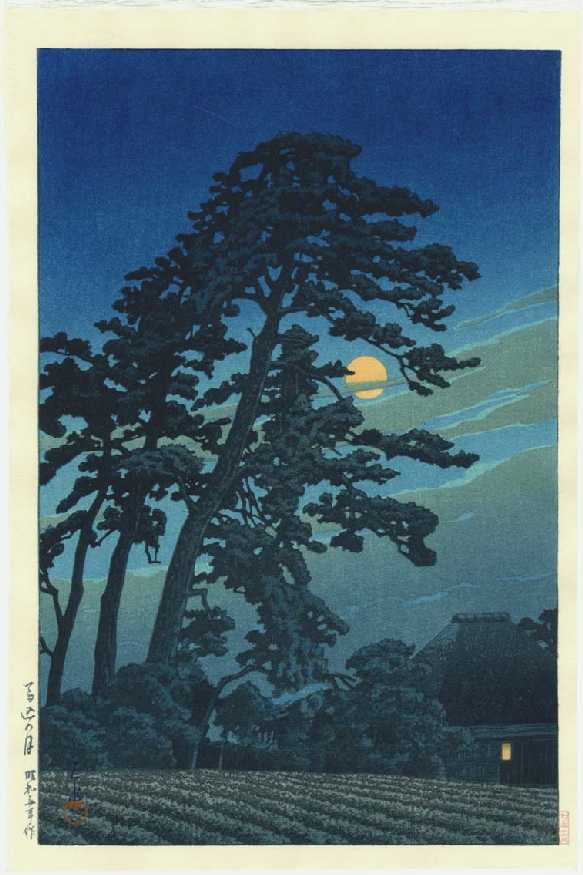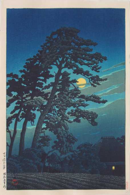 Beautiful moonlit scene done almost entirely as an "aizuri" (shades of blue) print. Reissued in 2004-2005 by Watanabe using their original woodblocks from 1930.