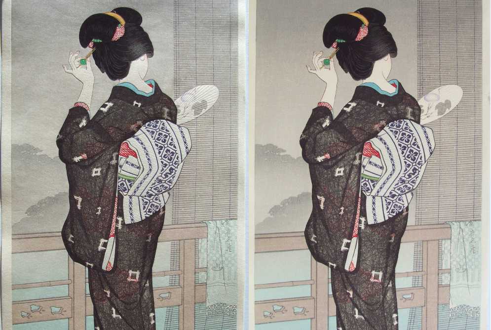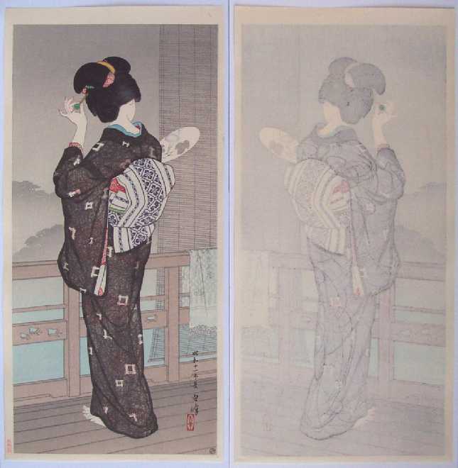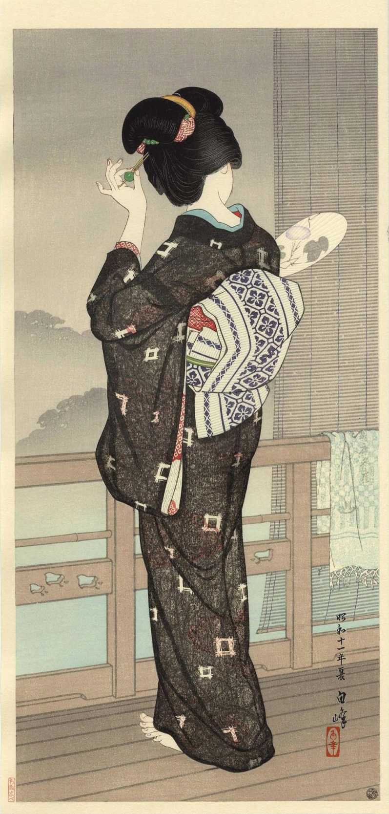 Dressed in a light summer kimono, a beauty gazes from her hotspring's balcony. (Lifetime total of only 6 known