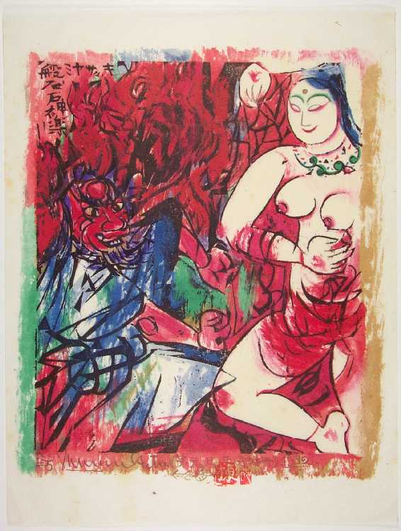 Fine. Bold black-ink/color "sosaku" printing on thin Japanese paper. |