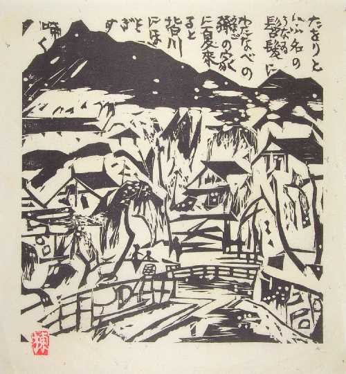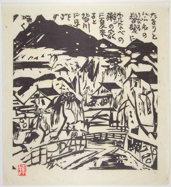An attractive, bold "sosaku hanga" image. Munakata is well-known for his spontaneously carved black/white prints. |