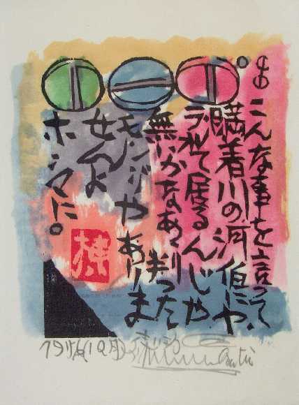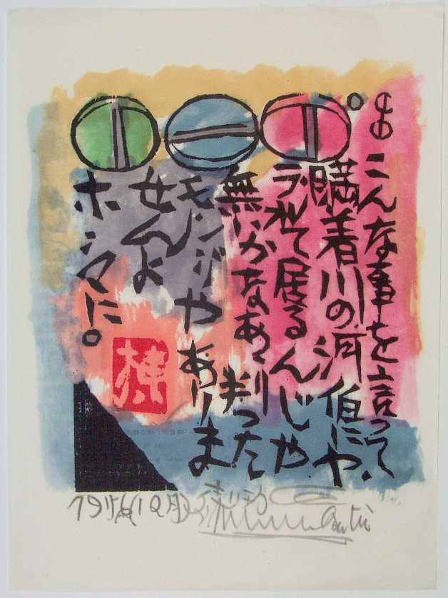 Fine. Bold black-ink/color "sosaku" printing (lithographic?) on thin Japanese paper. |