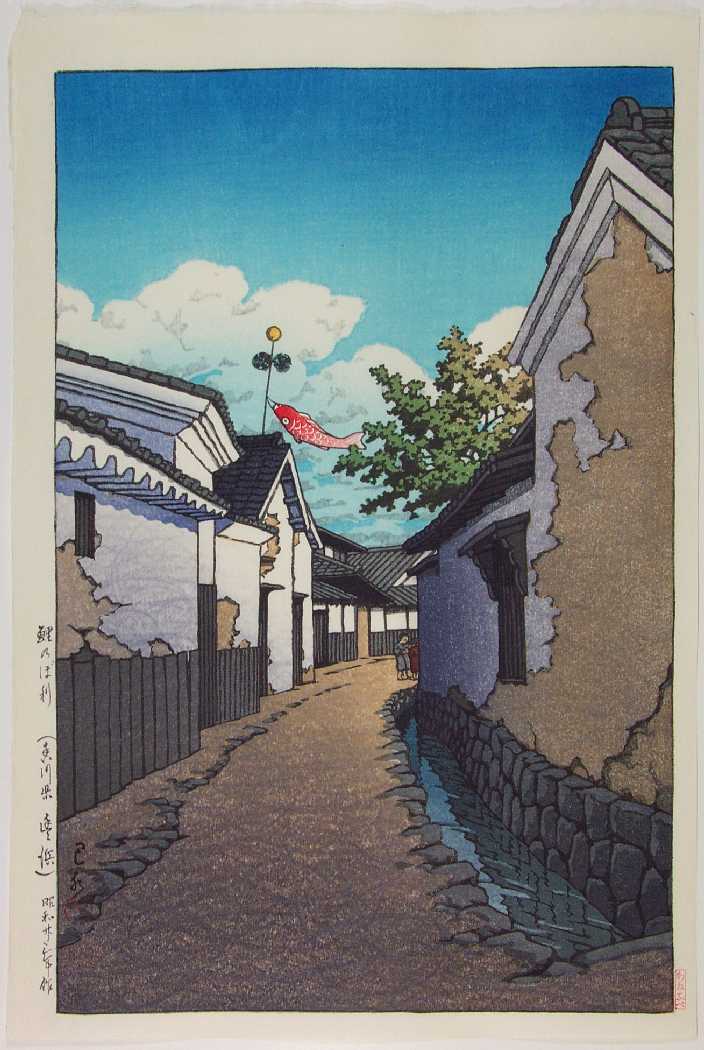 Beautiful rural streetscene-- "carp windsocks" are flown throughout Japan
